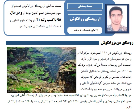 نعمت بساطی از روستای زر انگوش هستم از سوم دبیرستان عضو کانون بوده ام و در سال با کسب 95 رتبه 21 در رشته علوم قضایی و خدمات اداری دادگستری قبول شدم.