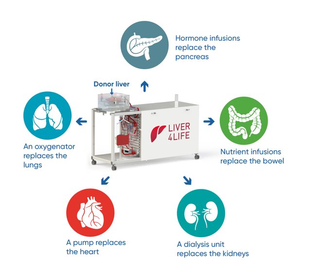 دانشمندان بیمارستان دانشگاه زوریخ، موسسه فناوری زوریخ(ETH)، موسسه "ویس" زوریخ(Wyss) و دانشگاه زوریخ برای بهبود عملکرد دستگاه پرفیوژن کبد، عملکرد دقیق بدن انسان را در آن شبیه سازی کردند و طی این دوره چهار ساله توانستند تعدادی از کارکردهای فیزیولوژیکی را از جمله کنترل خودکار میزان گلوکز و اکسیژن رسانی به همراه دفع مواد زائد و مدیریت هماتوکریت یا غلظت گلبولهای قرمز در خون در این دستگاه ادغام کنند. این ماشین با کبد خوک آماده و آزمایش شده است و محققان قادر به زنده نگه داشتن آن تا یک هفته شدهاند.