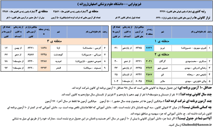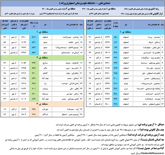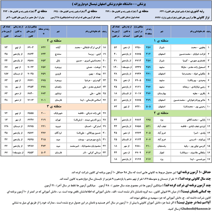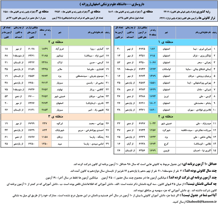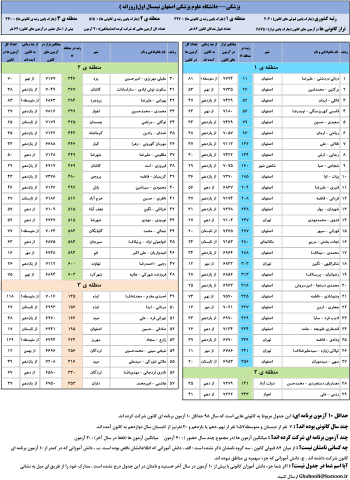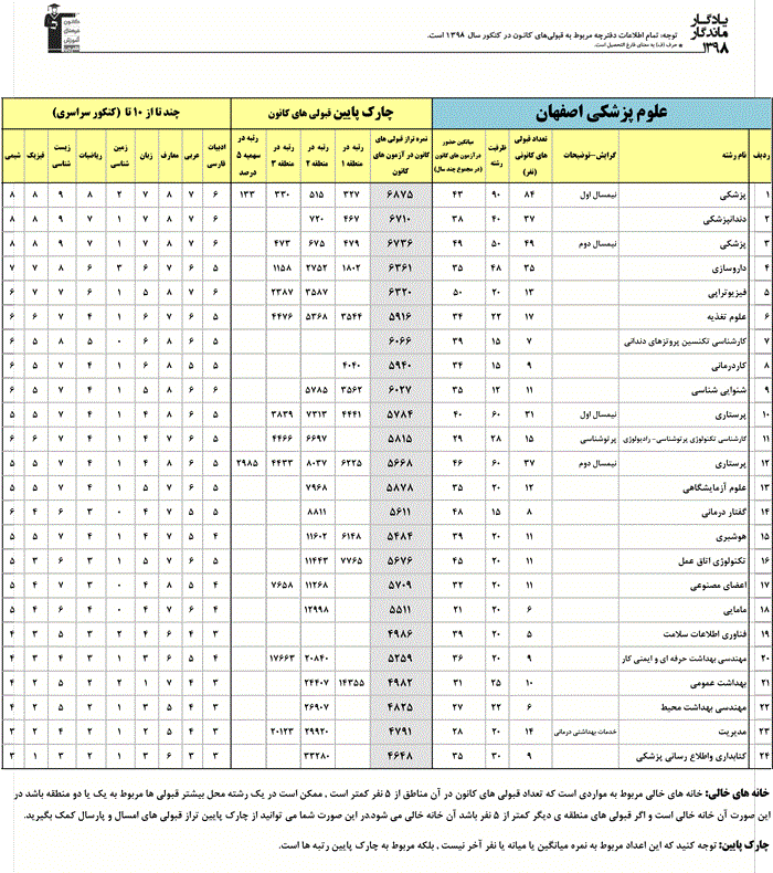 یادگار ماندگار : قبولی های کانونی دانشگاه علوم پزشکی اصفهان در همه رشته ها در سال 98 را در ادامه مشاهده کنید.فایل با کیفیت قبولی های سال 98 را در قسمت فایل های ضمیمه دانلود کنید.