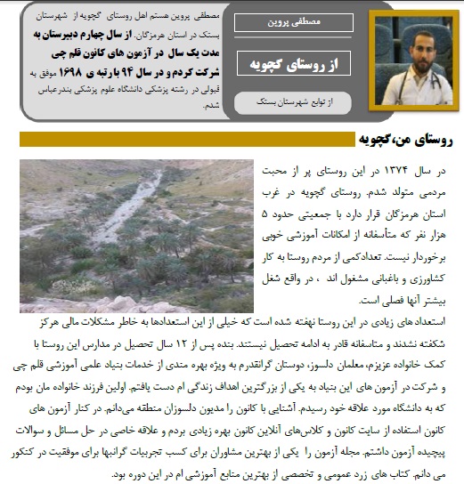 مصطفی پروین هستم اهل روستای گچویه از شهرستان بستک در استان هرمزگان. از سال چهارم دبیرستان به مدت یک سال در آزمون های کانون قلم چی شرکت کردم و در سال 94 با رتبه ی 1698 موفق به قبولی در رشته پزشکی دانشگاه علوم پزشکی بندرعباس شدم.