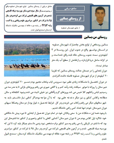 صادق دریایی از روستای بساتین توابع شهرستان عسلویه واقع دربوشهرهستم.از سال سوم دبیرستان بورسیه بنیاد قلمچی شدم و در آزمون های قلمچی شرکت می کردم ودر سال 95 با شرکت در کنکور سراسری علوم ریاضی و با کسب رتبه 4354 در رشته مورد علاقه ام مهندسی مکانیک دانشگاه کردستان-سنندج قبول شدم.