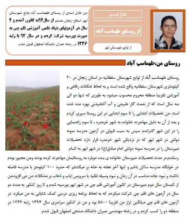 من عادل اسدی از روستای طهماسب آباد توابع شهرستان ابهر استان زنجان هستم از سال 92 به کانون آمدم و 2 سال در آزمونهای بنیاد علمی آموزشی قلم چی به صورت بورسیه شرکت کردم و در سال 94 با رتبه1236 در رشته عمران دانشگاه اصفهان قبول شدم.