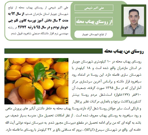 علی اکبر ذبیحی از روستای پهناب محله از توابع شهرستان جویبار استان مازندران هستم، از سال 92 به مدت 3 سال دانش آموز بورسیه کانون قلم چی جویبار بودم و در سال 95 با رتبه 2672 در رشته مهندسی نرم افزار دانشگاه صنعتی شاهرود قبول شدم.