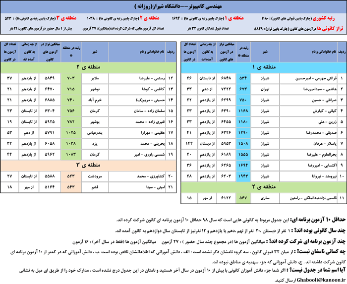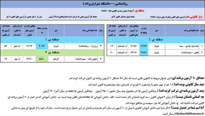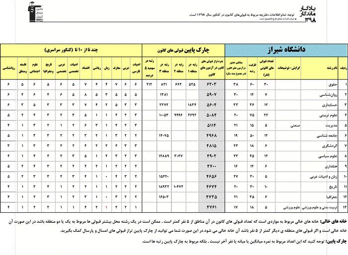یادگار ماندگار : قبولی های کانونی دانشگاه شیراز در همه رشته ها در سال 98 را در ادامه مشاهده کنید.
