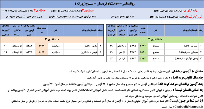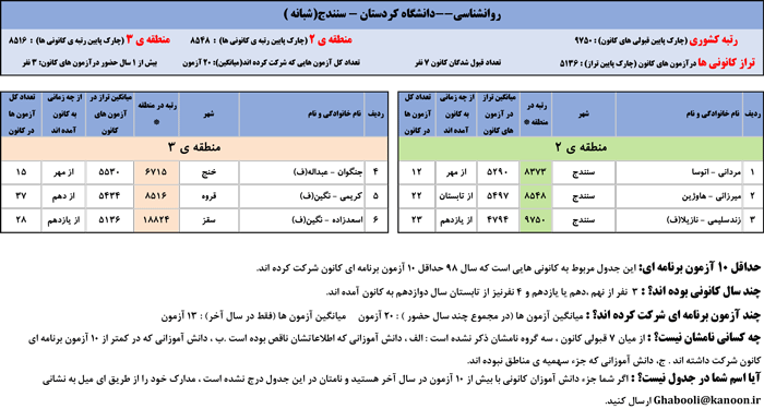یادگار ماندگار : قبولی های کانونی دانشگاه کردستان - سنندج در همه رشته ها در سال 98 را در ادامه مشاهده کنید.فایل با کیفیت قبولی های سال 98 را در قسمت فایل های ضمیمه دانلود کنید.