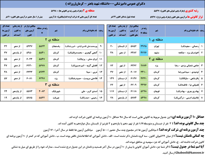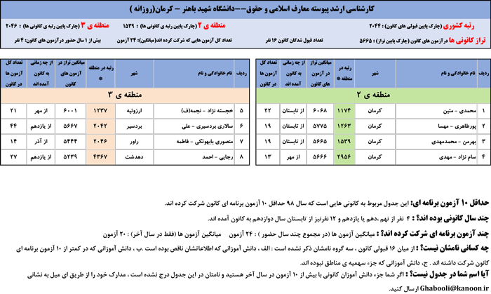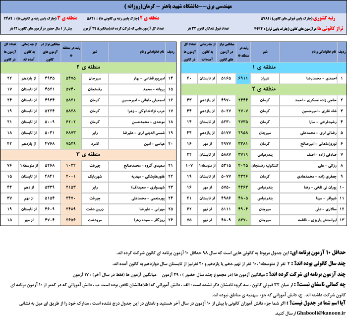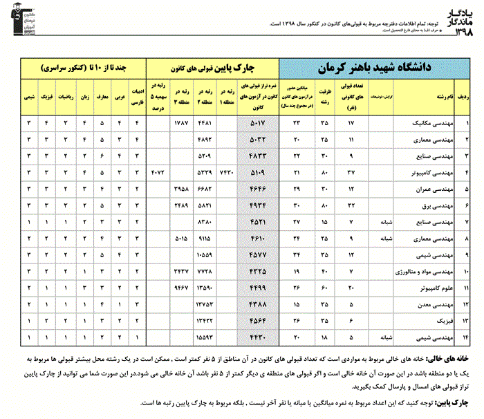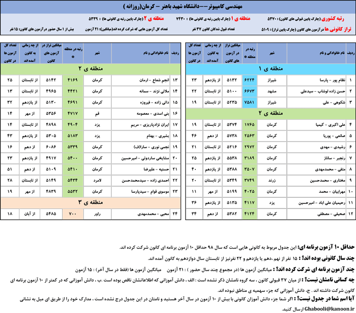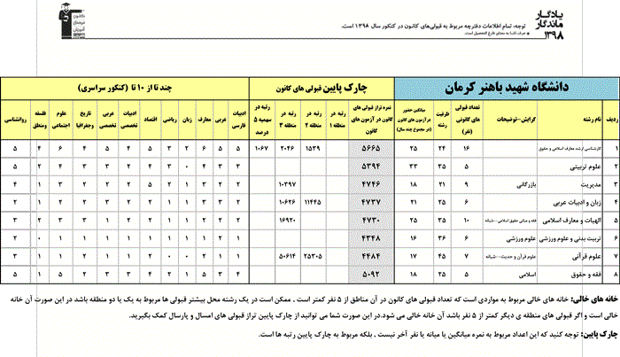 یادگار ماندگار : قبولی های کانونی دانشگاه شهید باهنر کرمان در همه رشته ها در سال 98 را در ادامه مشاهده کنید.فایل با کیفیت قبولی های سال 98 را در قسمت فایل های ضمیمه دانلود کنید.