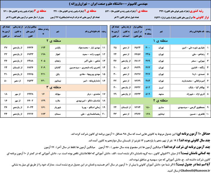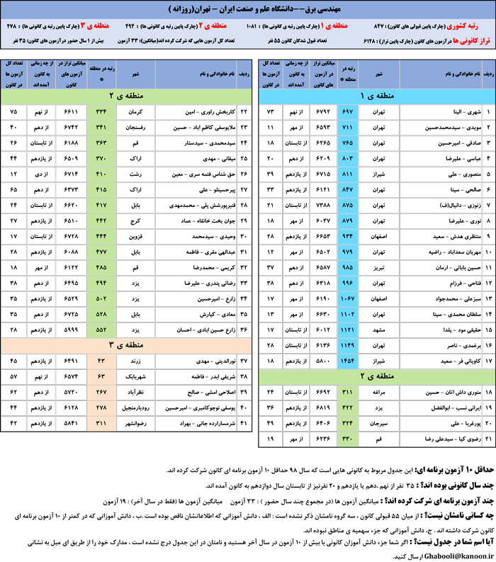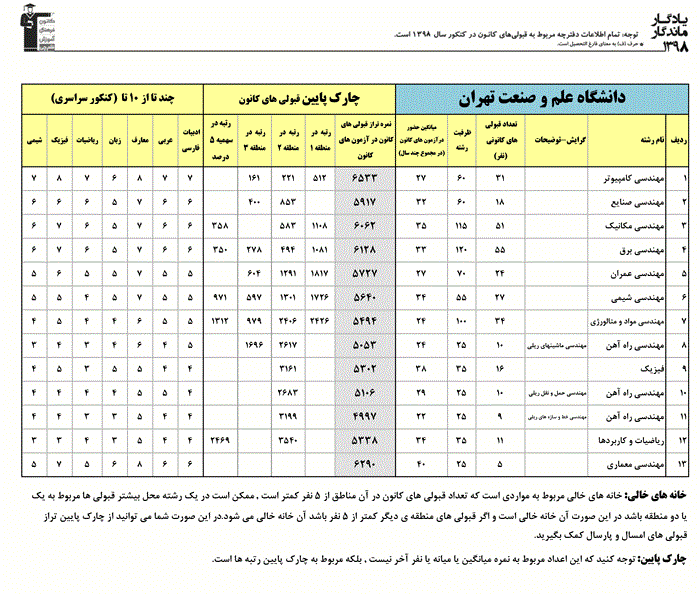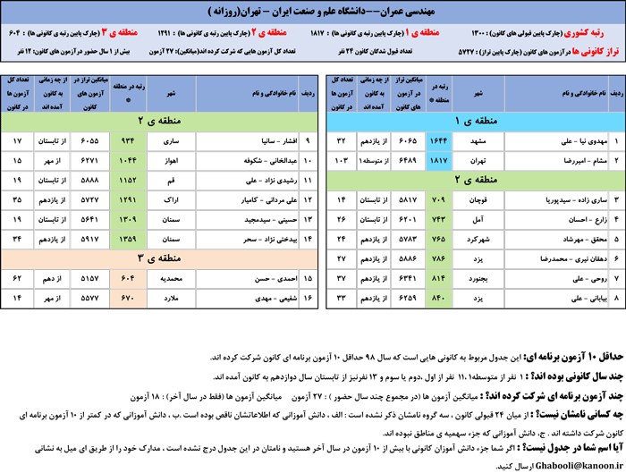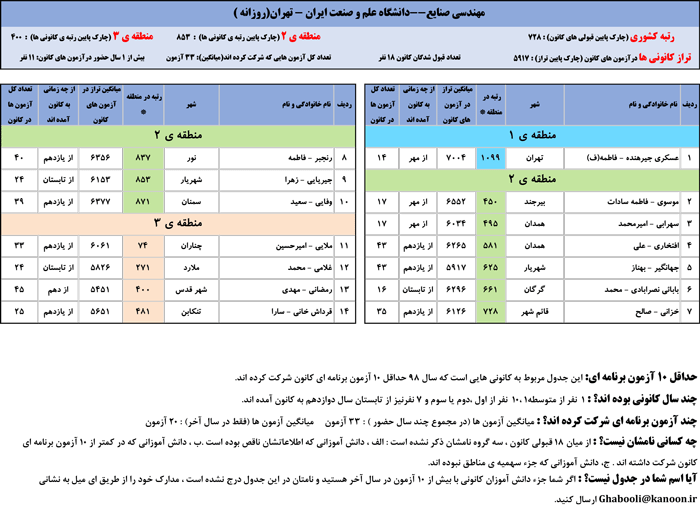 یادگار ماندگار : قبولی های کانونی دانشگاه علم و صنعت ایران در همه رشته ها در سال 98 را در ادامه مشاهده کنید.فایل با کیفیت قبولی های سال 98 را در قسمت فایل های ضمیمه دانلود کنید.