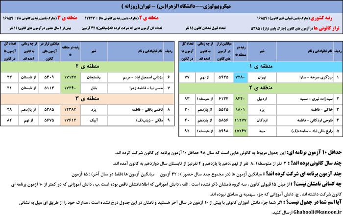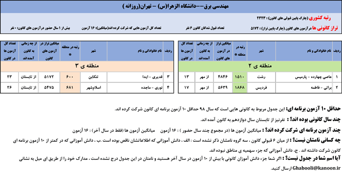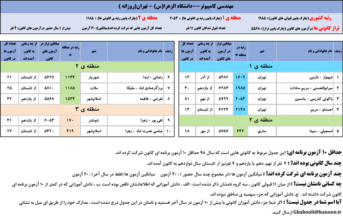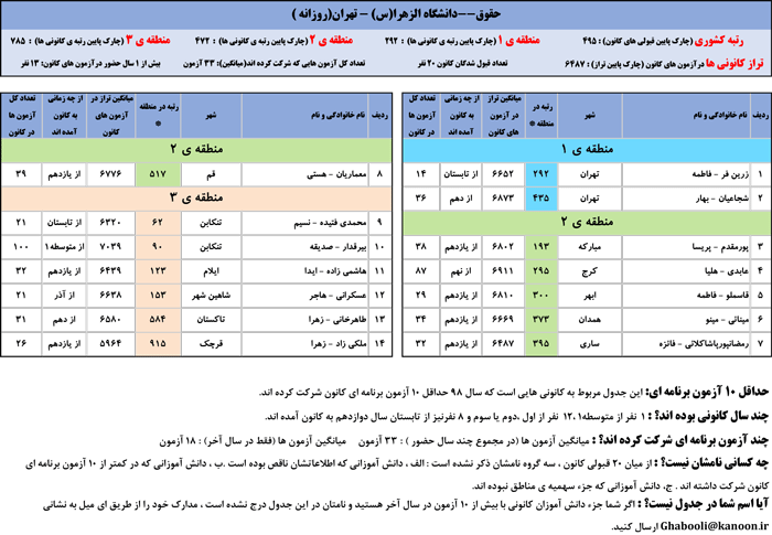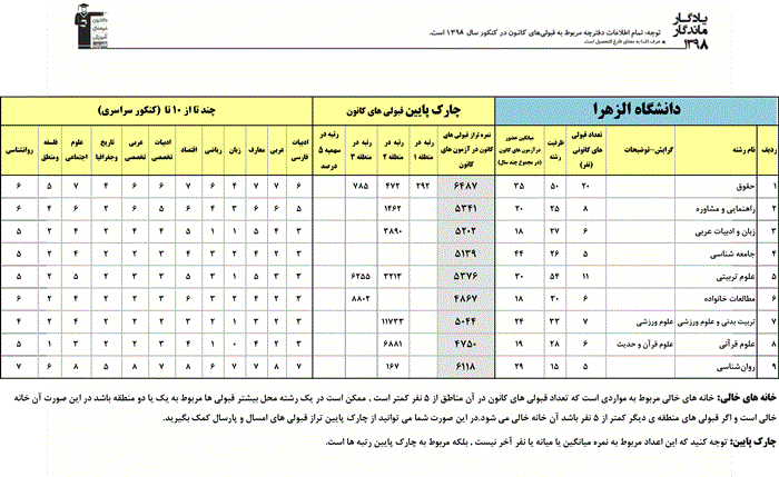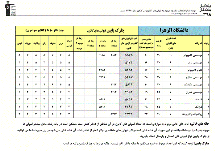 یادگار ماندگار : قبولی های کانونی دانشگاه الزهرا در همه رشته ها در سال 98 را در ادامه مشاهده کنید.فایل با کیفیت قبولی های سال 98 را در قسمت فایل های ضمیمه دانلود کنید.