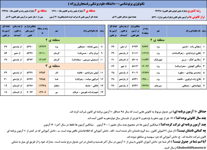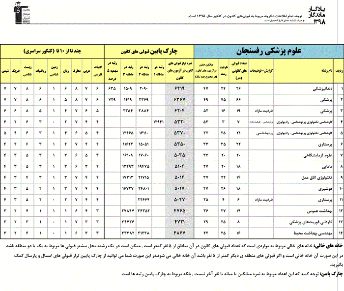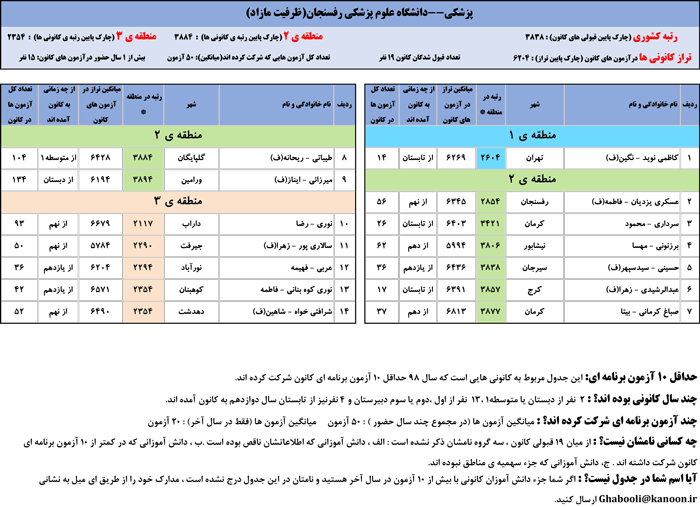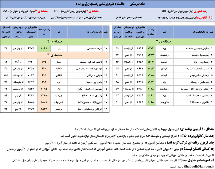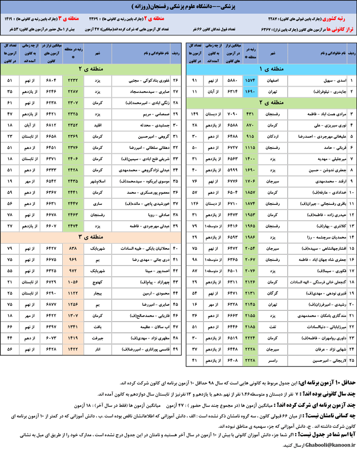 یادگار ماندگار : قبولی های کانونی دانشگاه علوم پزشکی رفسنجان در همه رشته ها در سال 98 را در ادامه مشاهده کنید.فایل با کیفیت قبولی های سال 98 را در قسمت فایل های ضمیمه دانلود کنید.