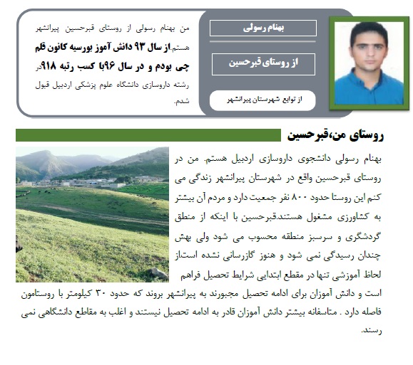 من بهنام رسولی از روستای قبرحسین پیرانشهرهستم.از سال 93 دانش آموز بورسیه کانون قلم چی بودم و در سال 96 با کسب رتبه 918 دررشته داروسازی دانشگاه علوم پزشکی اردبیل قبول شدم.