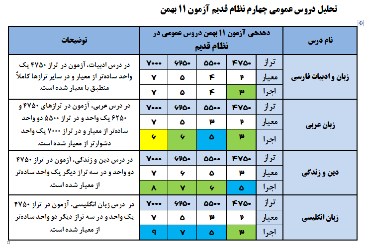 در جدول زیر تحلیل سیستم دهدهی دروس عمومی نظام قدیم در آزمون 11 بهمن را مشاهده میکنید.