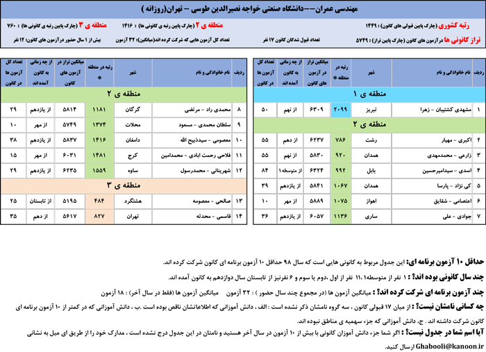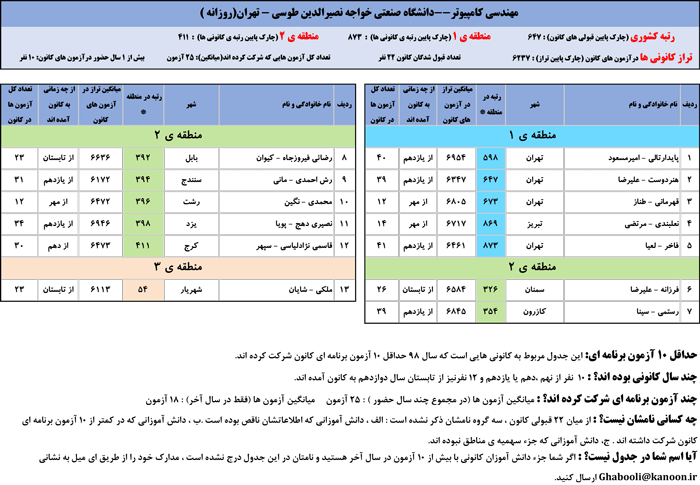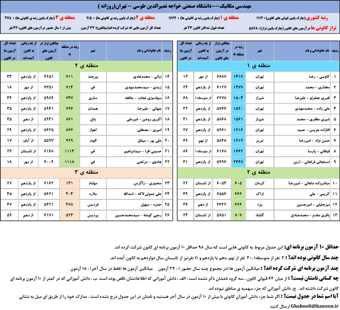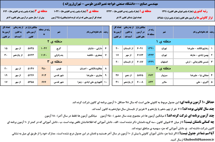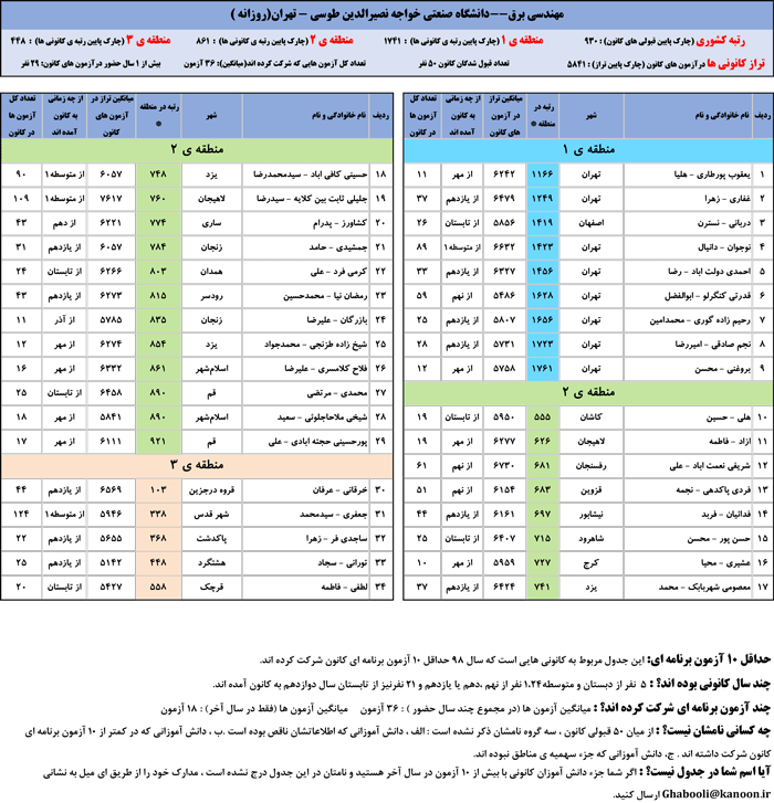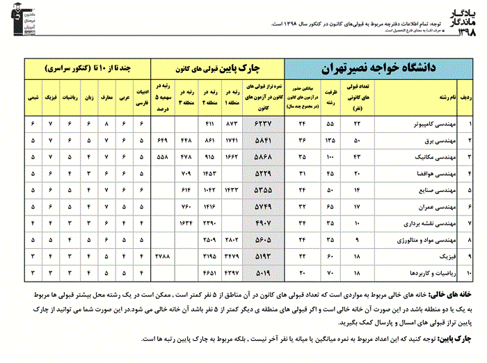 یادگار ماندگار : قبولی های کانونی دانشگاه خواجه نصیر الدین طوسی در همه رشته ها در سال 98 را در ادامه مشاهده کنید.فایل با کیفیت قبولی های سال 98 را در قسمت فایل های ضمیمه دانلود کنید.