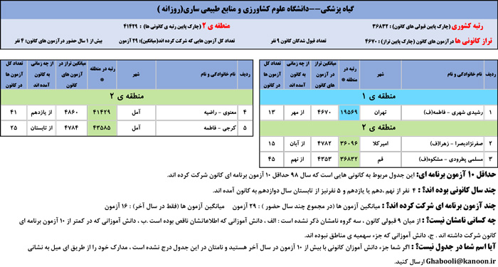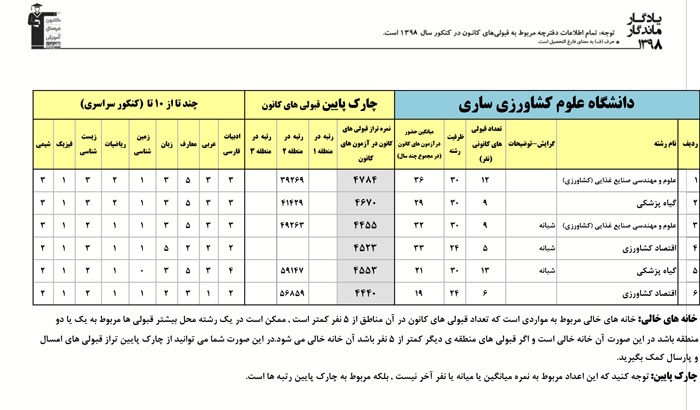یادگار ماندگار : قبولی های کانونی دانشگاه علوم کشاورزي ساري در همه رشته ها در سال 98 را در ادامه مشاهده کنید.فایل با کیفیت قبولی های سال 98 را در قسمت فایل های ضمیمه دانلود کنید.