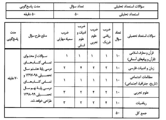 سؤالات استعداد تحصیلی به شیوة چهارگزینهای در سطح محتوای کتابهای درسی با تأکید بر سطوح بالای شناختی، تلفیق دانش، مفاهیم و مهارتهای دو یا چند ماده درسی در برخی سؤالات طراحی میشود.