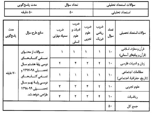 منابع، تعداد و ضرایب سوالات آزمون ورودی پایه دهم به شرح جدول زیر است: