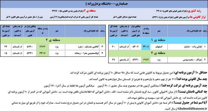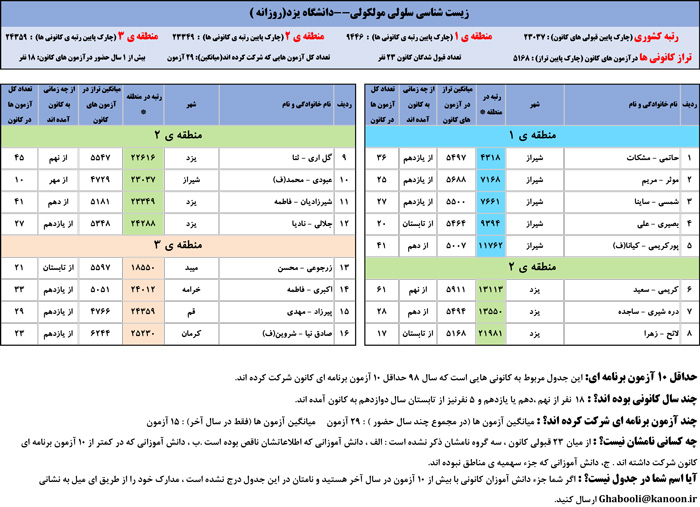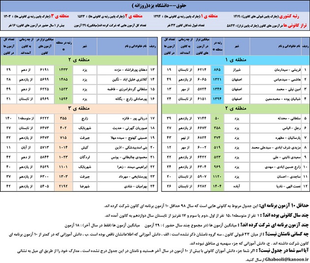 یادگار ماندگار : قبولی های کانونی دانشگاه یزد در همه رشته ها در سال 98 را در ادامه مشاهده کنید.فایل با کیفیت قبولی های سال 98 را در قسمت فایل های ضمیمه دانلود کنید.