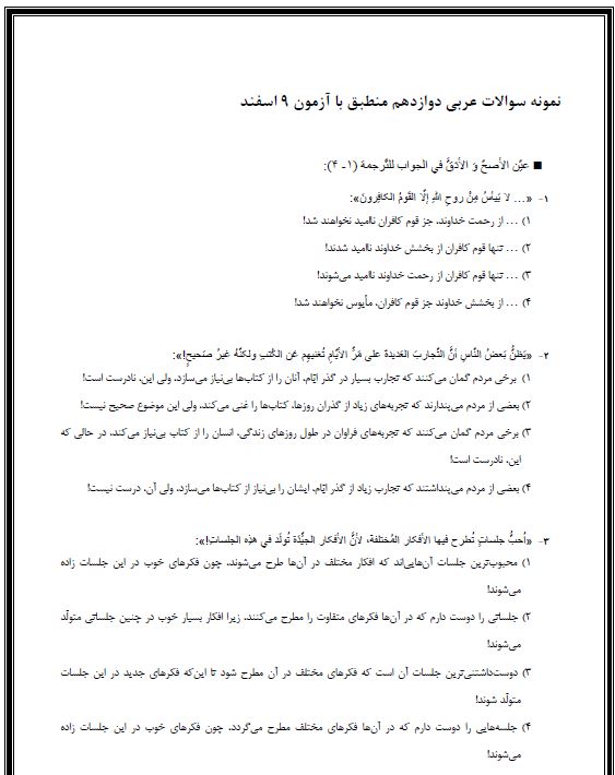 برای اطمینان از یادگیری هر مبحث در دری عربی و تقویت سرعت عمل در تستزنی این درس بهتر است؛ در پایان مطالعهی هر مبحث حداقل 10 سوال مربوط به آن درس و مبحث حل شود.در این قسمت نمونه سوالات عربی دوازدهم منطبق با آزمون 9 اسفند به همراه پاسخنامه را مشاهده میکنید.برای مشاهدهی ادامهی مطلب فایل ضمیمه را دانلود کنید.
