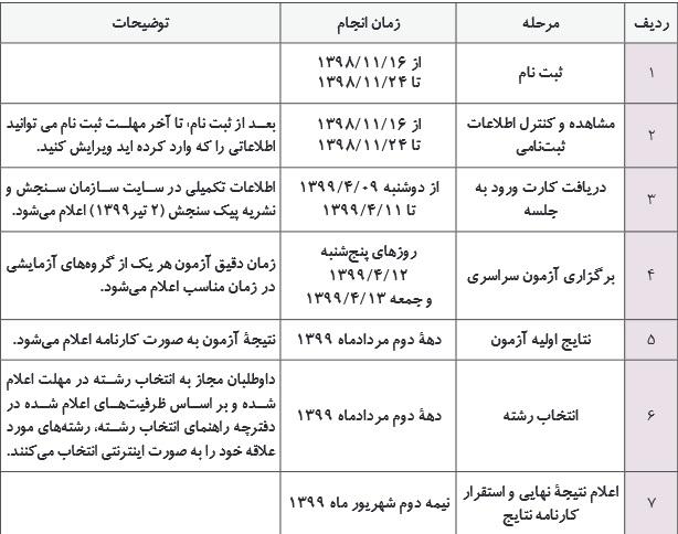 جزئیات زمان بندی کنکور سراسری سال 99 در جدول ذیل قابل مشاهده است.