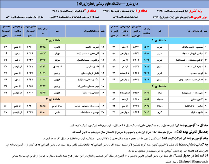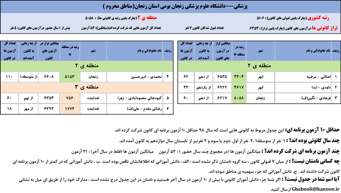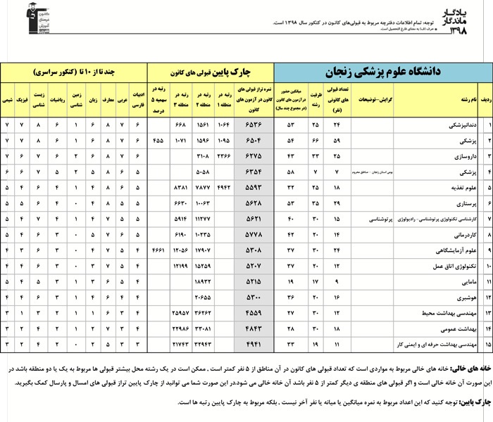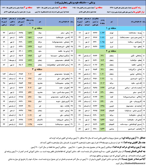 یادگار ماندگار : قبولی های کانونی دانشگاه علوم پزشکی زنجان در همه رشته ها در سال 98 را در ادامه مشاهده کنید.فایل با کیفیت قبولی های سال 98 را در قسمت فایل های ضمیمه دانلود کنید.
