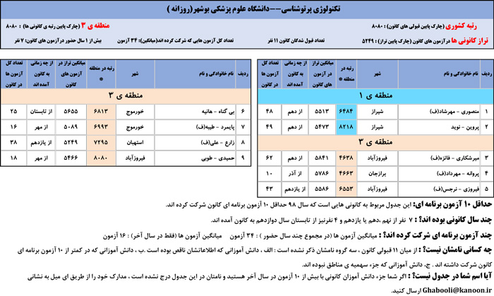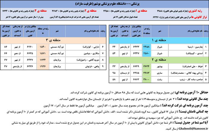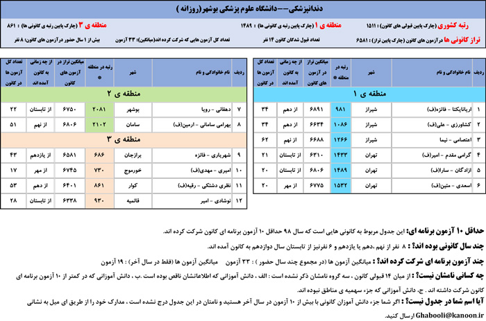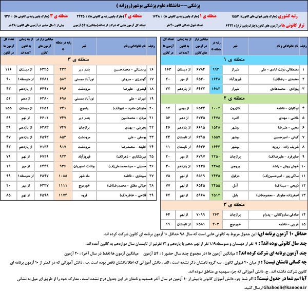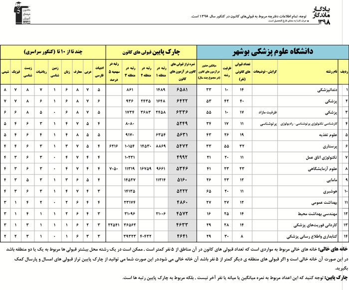 یادگار ماندگار : قبولی های کانونی دانشگاه علوم پزشکی بوشهر در همه رشته ها در سال 98 را در ادامه مشاهده کنید.فایل با کیفیت قبولی های سال 98 را در قسمت فایل های ضمیمه دانلود کنید.