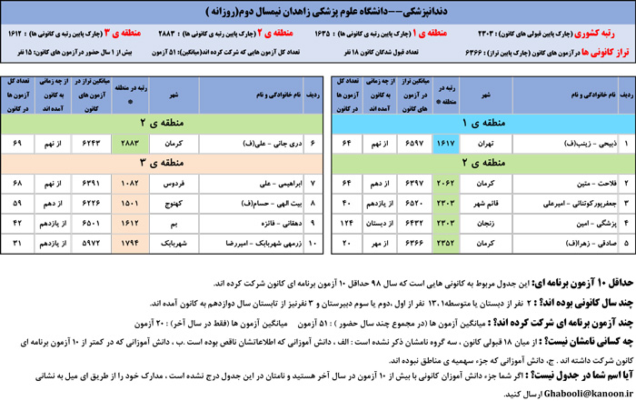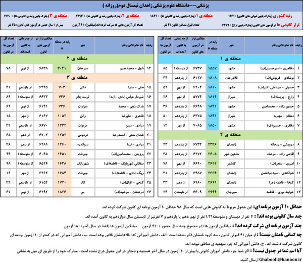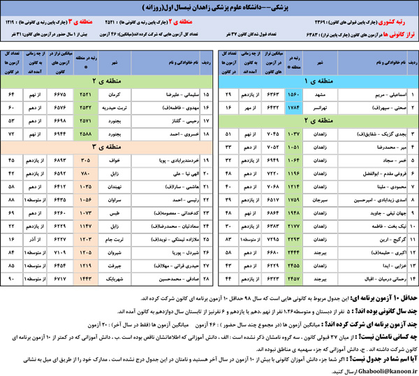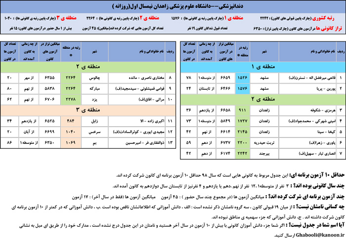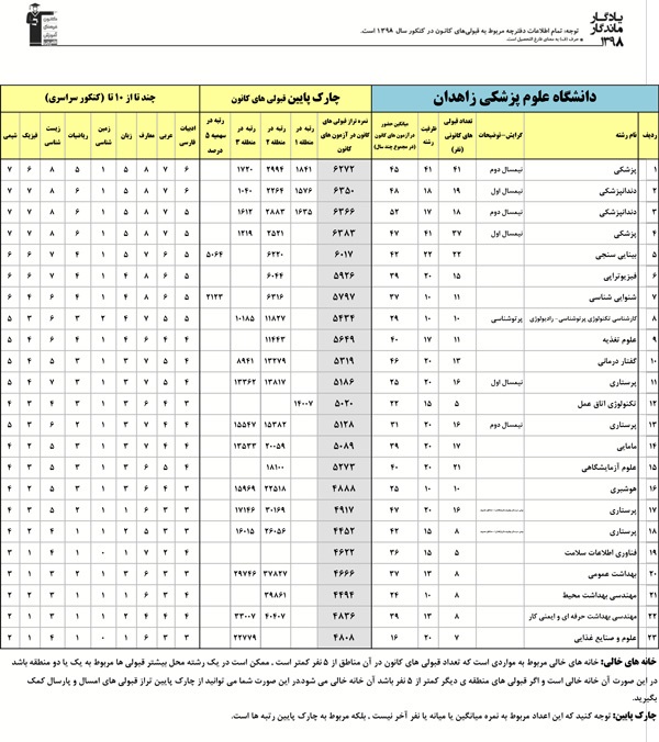 یادگار ماندگار : قبولی های کانونی دانشگاه علوم پزشکی زاهدان در همه رشته ها در سال 98 را در ادامه مشاهده کنید.فایل با کیفیت قبولی های سال 98 را در قسمت فایل های ضمیمه دانلود کنید.