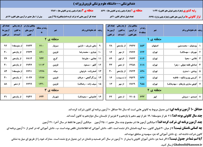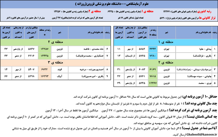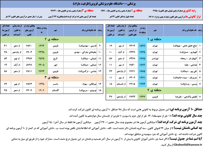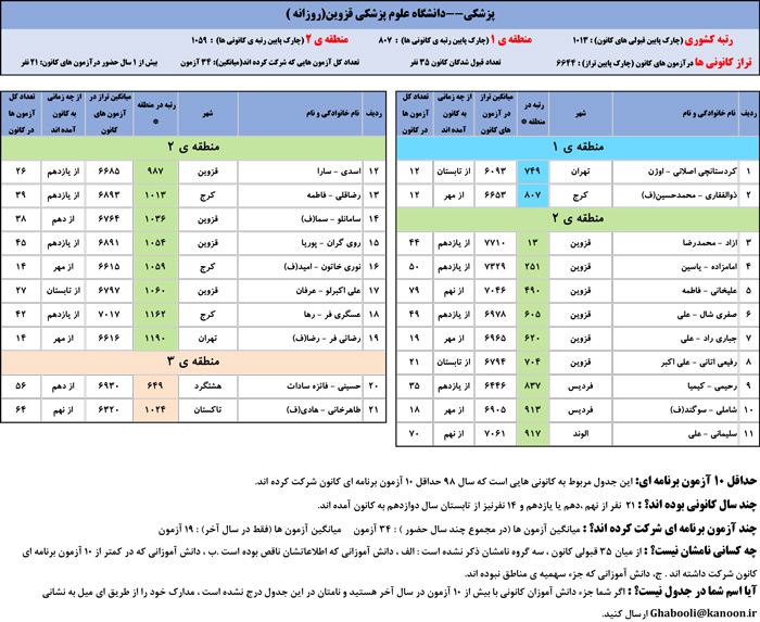 یادگار ماندگار : قبولی های کانونی دانشگاه علوم پزشکی قزوین در همه رشته ها در سال 98 را در ادامه مشاهده کنید.فایل با کیفیت قبولی های سال 98 را در قسمت فایل های ضمیمه دانلود کنید.