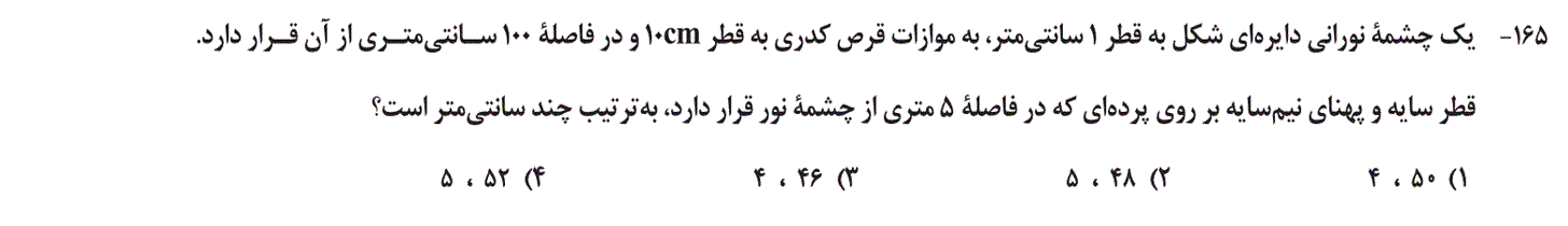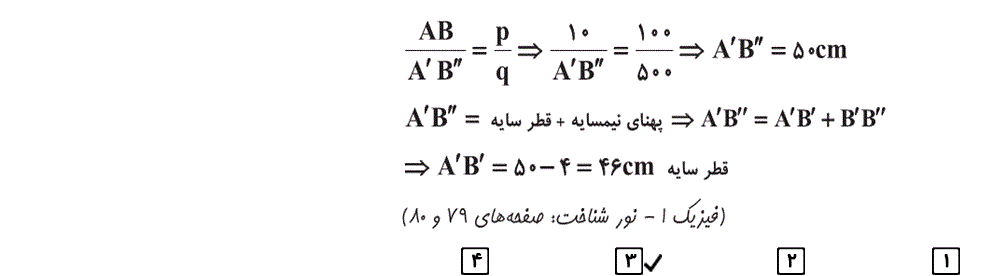 بررسیها نشان میدهد دانش آموزان پهنای سایه را قطر دایرهای که روی پرده افتاده در نظر گرفتهاند و پهنای نیمسایه را از آن کسر نکردهاند و به همین دلیل گزینه نادرست 1 را به عنوان پاسخ در نظر گرفتهاند.