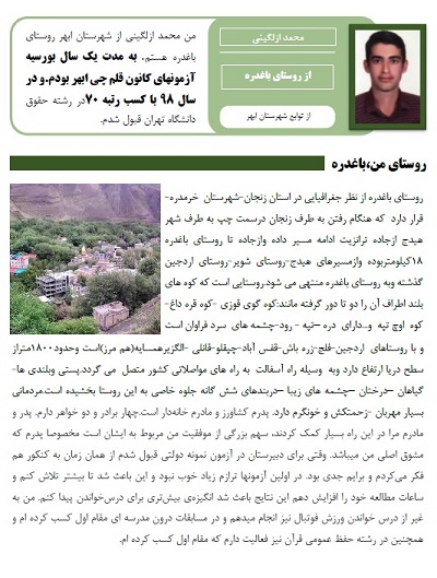 من محمد ازلگینی از شهرستان ابهر روستای باغدره هستم. به مدت یک سال بورسیه آزمونهای کانون قلم چی ابهر بودم.و در سال 98 با کسب رتبه 70در رشته حقوق دانشگاه تهران قبول شدم.