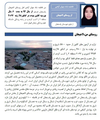 من فاطمه جعفری شاه جهان آبادی اهل روستای لاهیجان رفسنجان هستم. از سال 92 به مدت 6 سال بورسیه کانون بودم در کنکور98 رتبه 2067 منطقه 2 را کسب کردم و در رشته پزشکی دانشگاه علوم پزشکی رفسنجان قبول شدم.