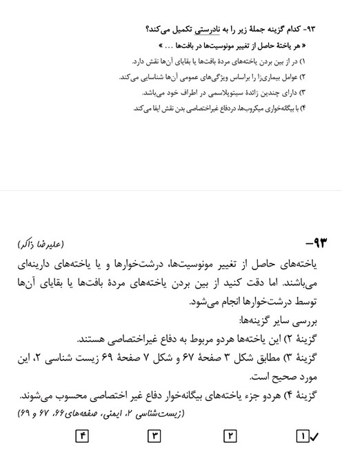 علت اصلی انتخاب اشتباه این دانشآموزان، توجه نکردن به واژه "هر یاخته" در صورت سوال و به دنبال آن در نظر نگرفتن یاختههای دندریتی هنگام بررسی گزینه "3" بوده است. علت عدم بررسی یاختههای دندریتی نیز عدم توجه به شکل 3 کتاب درسی و تنها اتکا به اطلاعات موجود در متن کتاب بوده است.