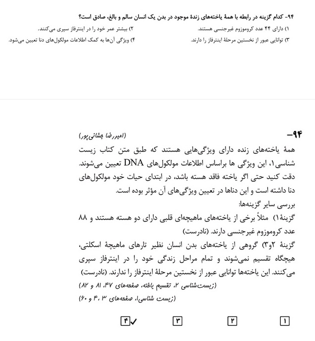 علت اصلی خطا در این دانشآموزان عدم توجه به قیدهای به کار برده شده در این سوال است. در این سوال دو قید مهم آورده شده. در صورت سوال به "همه یاختهها" اشاره شده و همچنین در گزینه "2" نیز گفته شده "بیشتر عمر خود". پس برای بررسی این گزینه لازم بوده که یاختهای را پیدا کنیم که بیشتر عمر خود را در اینترفاز سپری نمیکند. همانطور که در پاسخ تشریحی نیز آورده شده یاختهای فاقد این ویژگی وجود دارد و به همین دلیل این گزینه نادرست است.