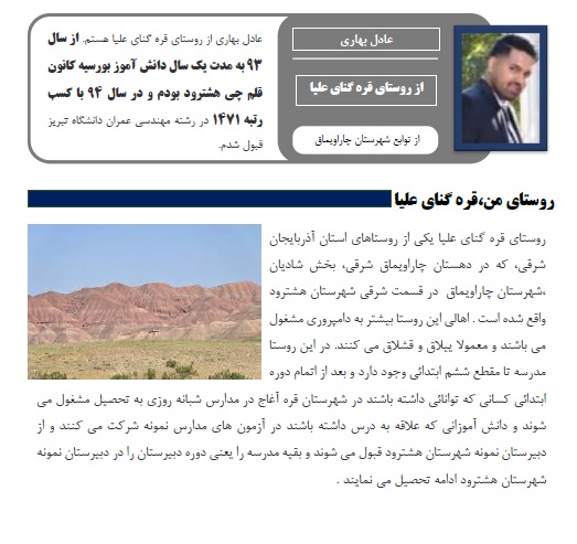 عادل بهاری از روستای قره گنای علیا هستم. از سال93 به مدت یک سال دانش آموز بورسیه کانون قلم چی هشترود بودم و در سال 94 با کسب رتبه 1471 در رشته مهندسی عمران دانشگاه تبریز قبول شدم.