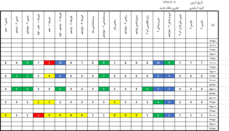 آن چه در فایل های زیر دانلود خواهید کرد .الگوی کلی کارنامه ی نردبانی است و برای مثال نشان می دهد ترازهای 5500در هر درس نمره ی چند از 10 شان چقدر است یا ترازهای 6250 در هر درس نمره های چند از 10 شان چقدر است . همان طور که مشاهده می کنید بازه ها را 750 تایی در نظر گرفته ایم