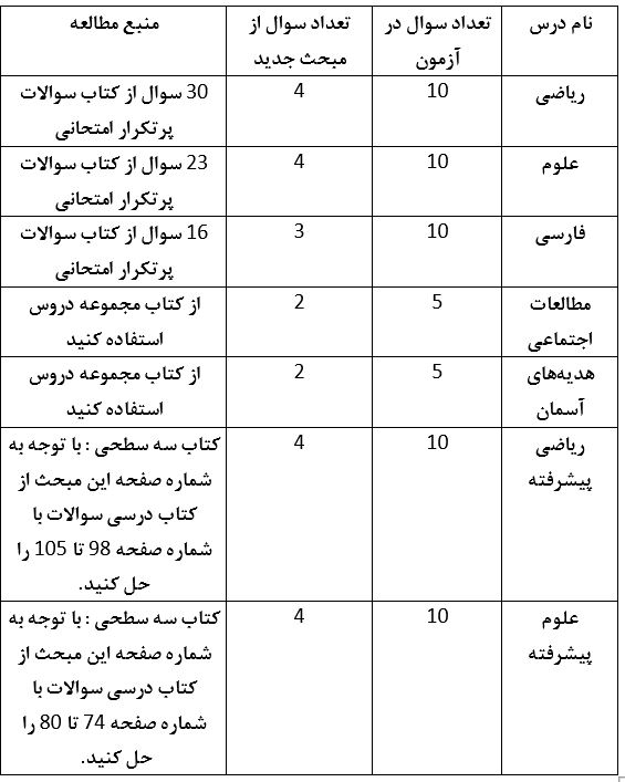 کتاب سوالات پرتکرار امتحانی : در این کتاب برای هر زیر موضوع تعدادی زیادی سوال آورده شده است. داشتن پاسخنامه تشریحی برای سوالات صفحات زوج برای یادگیری کمک کننده است . سوالات صفحات فرد هم برای محک زدن خودتان استفاده کنید.