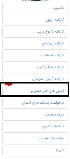 2) از منوی سمت راست آزمون غیرحضوری را انتخاب کنید.