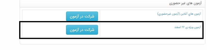 3) در قسمت آزمون ویژه 22 اسفند بر روی "شرکت در آزمون" کلیک کنید.