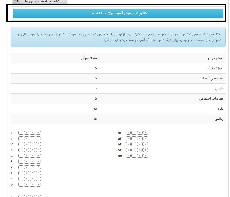 6)در این قسمت سوالات را میتوانید دریافت و پاسخ برگ را تکمیل کنید.