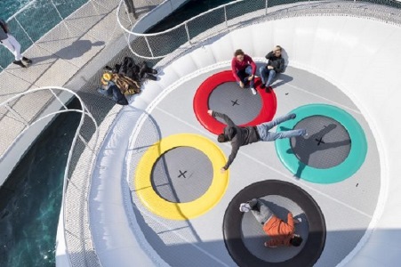 زمین بازی شناور گروه معماری WOA که بر روی دریاچهی پارک Futuroscope قرار دارد، با تکان هایی غیر قابل پیش بینی به پرش های افراد واکنش نشان میدهد. این تکان ها با تلفیق احساس بی وزنی و شادابی و حیرت، تجربهی یک سرگرمی جدید را برای بازدید گنندگان این پارک ارائه میدهد.