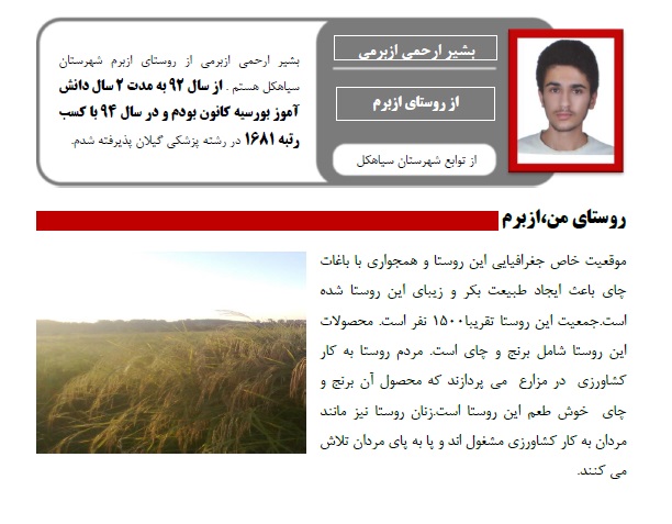 بشیر ارحمی ازبرمی از روستای ازبرم شهرستان سیاهکل هستم . از سال 92 به مدت 2 سال دانش آموز بورسیه کانون بودم و در سال 94 با کسب رتبه 1681 در رشته پزشکی گیلان پذیرفته شدم.