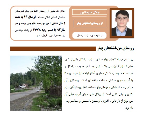 جلال علیجانپور از روستای اشکجان پهلو شهرستان سیاهکل استان گیلان هستم . از سال 93 به مدت 1 سال دانش آموز بورسیه قلم چی بودم و درسال 94 با کسب رتبه 3678 در رشته مهندسی برق محقق اردبیلی قبول شدم.
