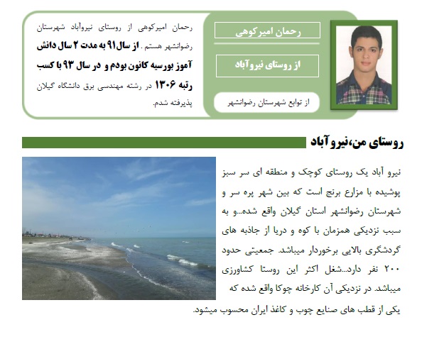 رحمان امیرکوهی از روستای نیروآباد شهرستان رضوانشهر هستم . از سال 91 به مدت 2 سال دانش آموز بورسیه کانون بودم و در سال 93 با کسب رتبه 1306 در رشته مهندسی برق دانشگاه گیلان پذیرفته شدم.