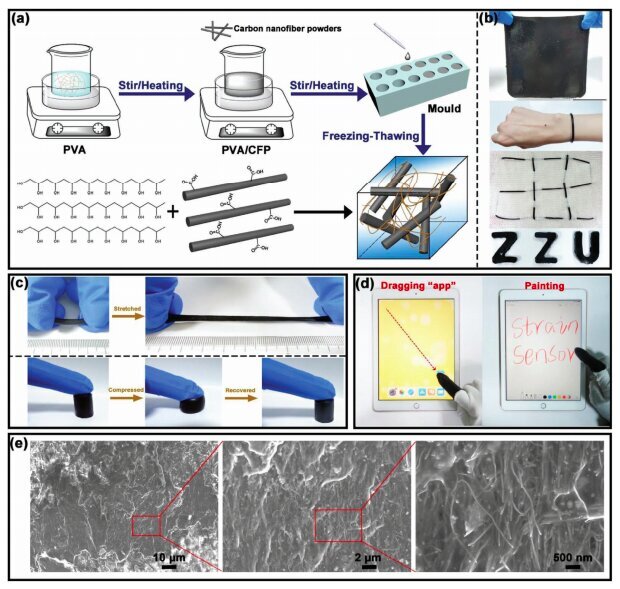 پژوهشگران با پخش کردن پودر نانو فیبر کربن در هیدروژل پلی وینیل الکل، توانستند کشش مکانیکی ماده را تقویت کنند و رسانایی الکتریکی آن را افزایش دهند. آنها در این پروژه، روش موسوم به "چرخه ذوب و انجماد" را به کار گرفتند که ماده را به صورت مکرر منجمد و ذوب میکند.