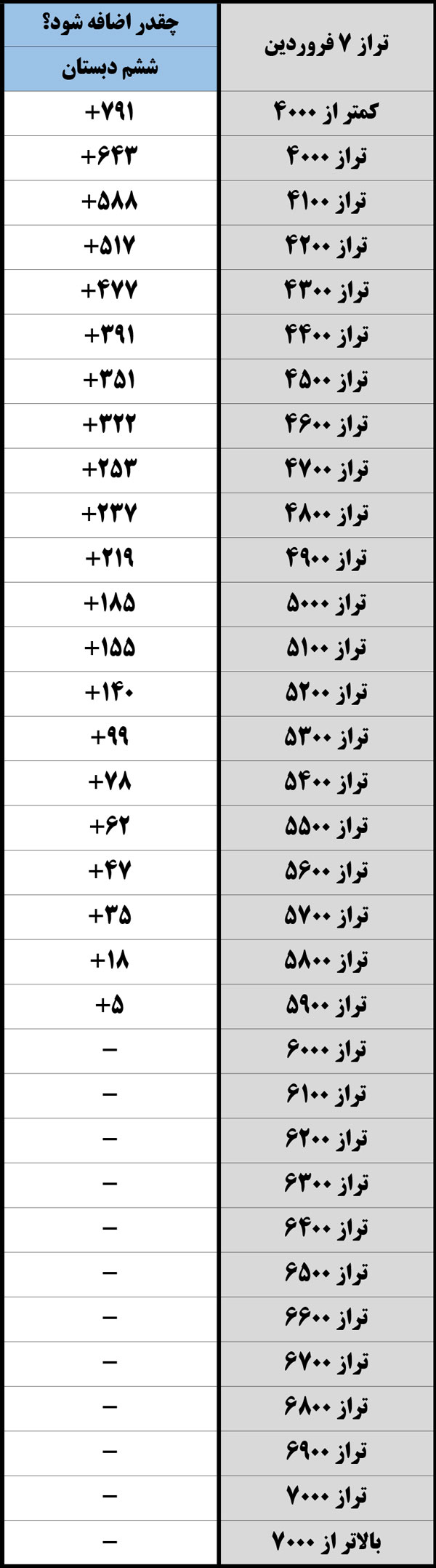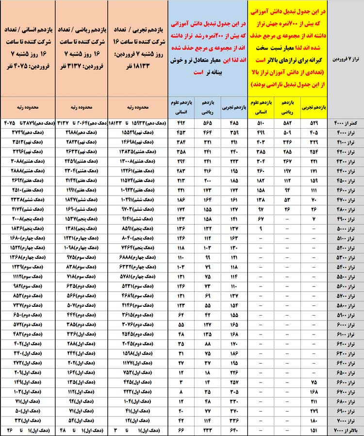 در جدول زیر رتبه های دانش آموزان برای آزمون 7 فروردین در بازه های ترازی صدتایی ارائه شده است .