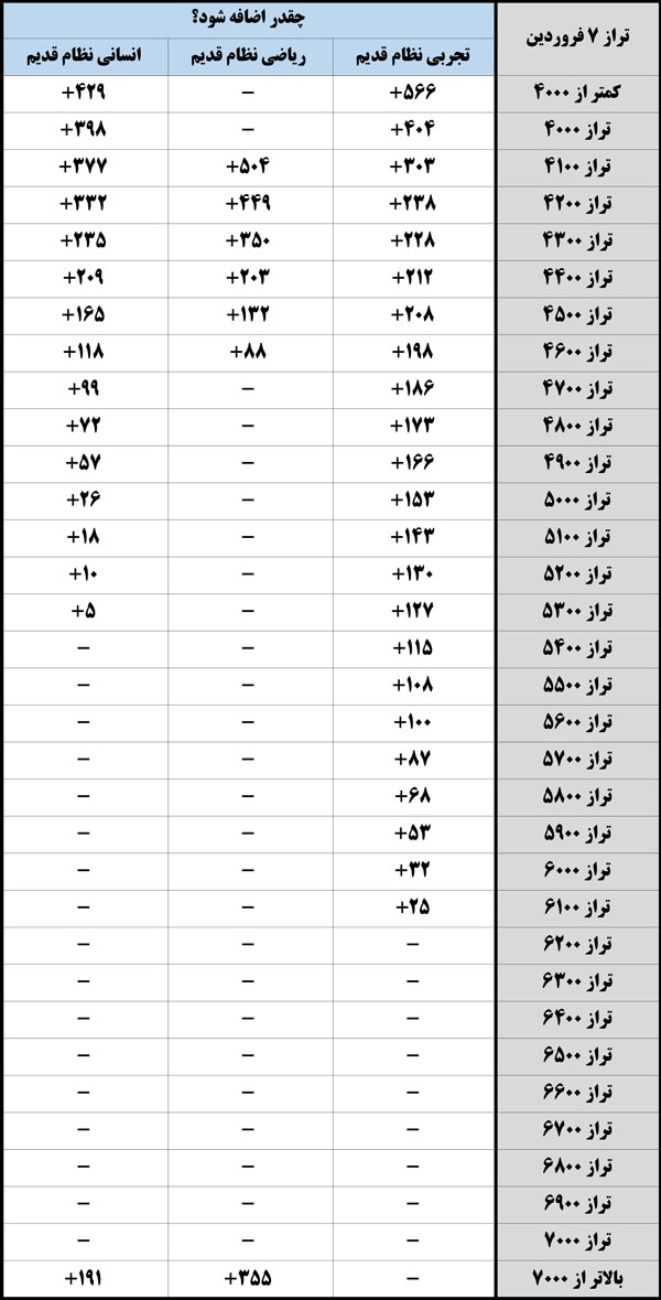 برای تبدیل تراز آزمون غیرحضوری 7 فروردین به تراز آزمون های حضوری از جدول های ضمیمه استفاده کنید . اعداد این جدول فقط برای بازه های ترازی است که می توانند برای معادل سازی ، آن اعداد را به تراز 7 فروردین خود اضافه کنند . خانه هایی که در جدول خالی هستند مشمول تبدیل و افزایش تراز نمی شوند .