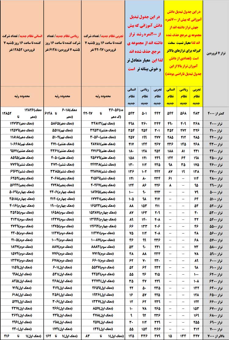 در جدول قبلی که برای برخی دانش آموزان ترازهای برتر ، سخت گیرانه به نظر می رسید . در جدول اول تبدیل تراز غیرحضوری به تراز حضوری ، آمار جهش ترازی را حذف کرده بودیم . معیار جهش تراز 700نمره در نظر گرفته شده بود . به همین دلیل نتیجه برای دانش آموزان برتر سخت گیرانه بود . اکنون در جدول فعلی اطلاعات مربوط به افزایش تراز 200 نمره ای را حذف کرده ایم ، اکنون این جدول دوم متعادل تر و خوش بینانه تر است . هر دو جدول را در کنار یکدیگر مشاهده می کنید .برای تبدیل تراز می توانید از هر کدام که خواستید ، سخت گیرانه تر یا متعادل تر ، کمک بگیرید .