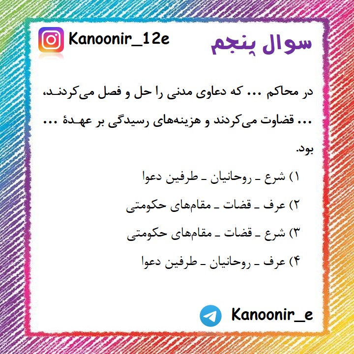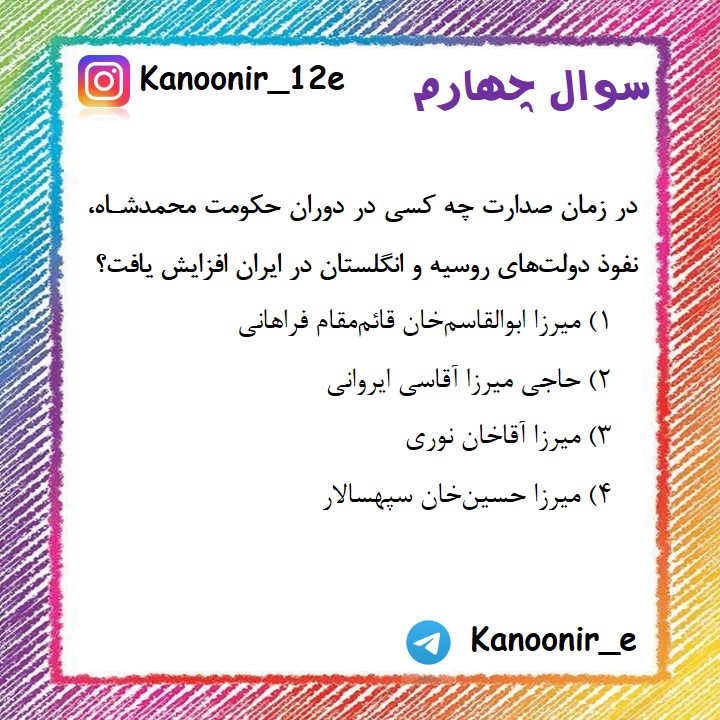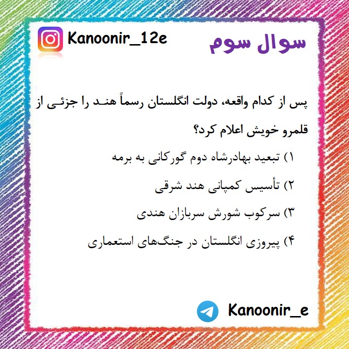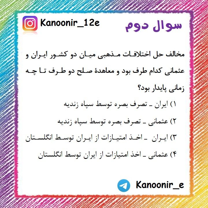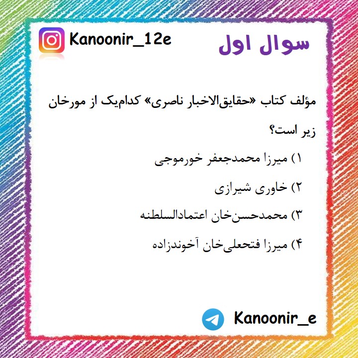 مجموعه تست گزینشگر: کیمیا طهماسبی - رتبه 7 کنکور سراسریمنطبق با آزمون 15 فروردینتاریخ پایه دوازدهم مباحث نیم سال اولادامه تست ها و پاسخ تشریحی را از قسمت فایل های ضمیمه دانلود کنید.تست اول:تست دوم:تست سوم:تست چهارم:تست پنجم: