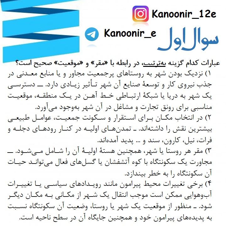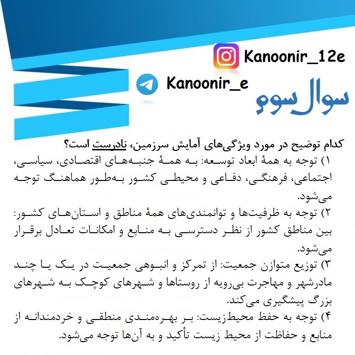 مجموعه تست گزینشگر سوالات : کیمیا طهماسبی - رتبه 7 کنکور سراسریمنطبق با آزمون 15 فروردینجغرافیا پایه دوازدهم مباحث نیم سال اولادامه تست ها و پاسخ تشریحی را از قسمت فایل های ضمیمه دانلود کنید.تست اول:تست دوم:تست سوم:تست چهارم:تست پنجم: