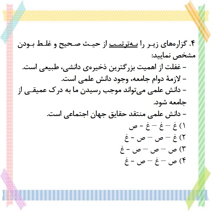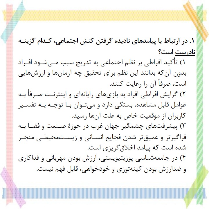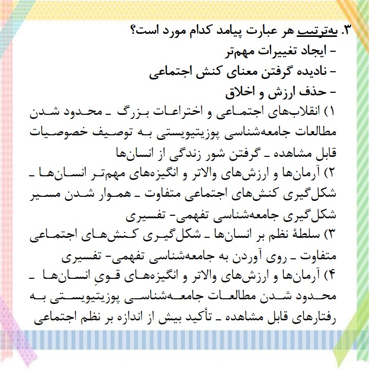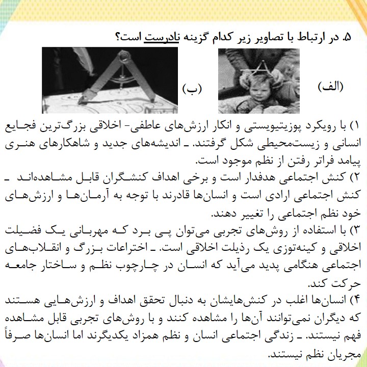 مجموعه تست جامعه شناسی پایه دوازدهم گزینشگر: کیمیا طهماسبی - رتبه 7 کنکور سراسریمنطبق با آزمون 15 فروردینمباحث نیم سال اولادامه تست ها و پاسخ تشریحی را از قسمت فایل های ضمیمه دانلود کنید.تست اول:تست دوم:تست سوم:تست چهارم:تست پنجم: