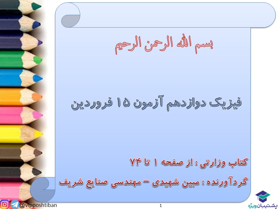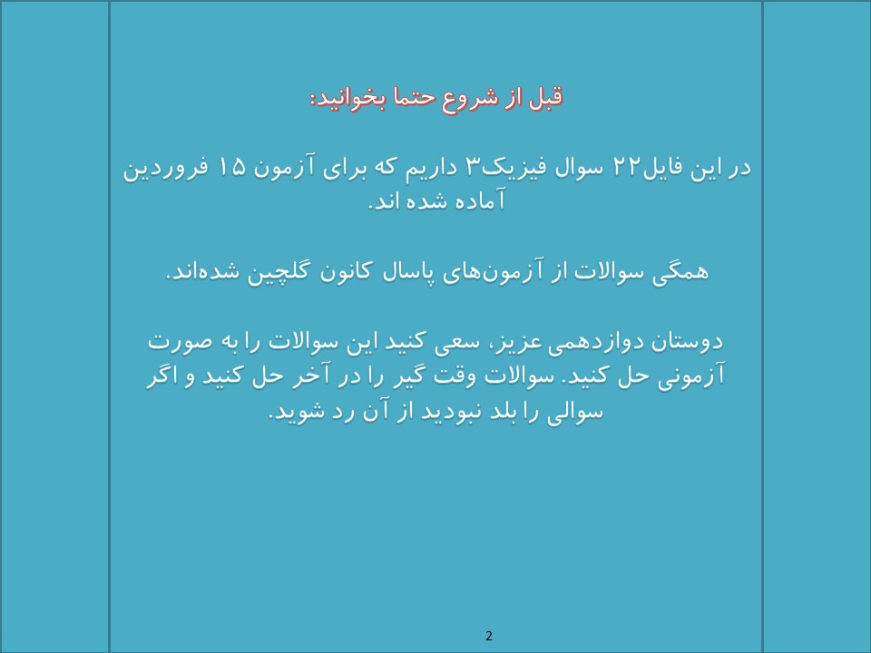 ان شاءالله که پر تلاش و امیدوار باشید. این فایل را به صورت آزمونی حل کنید و در آخر ببینید که اشکالاتتون در کدوم تست ها و در چه مباحثی بوده و بعد سعی کنید تا قبل از آزمون جمعه اون مباحث را بیشتر کار کنید و ازشون بیشتر تست بزنید. این طوری اشکالات خودتون را پیدا می کنید و با آمادگی بیشتری در درس فیزیک 3 می تونید آزمون بدید. در آخر فایل هم پاسخنامه تشریحی داریم که می تونید ازش استفاده کنید و اگه فکر می کنید که به فایل های صوتی هم نیاز دارید حتما فایل های صوتی را به همراه اسلاید های پاسخ گوش کنید . ان شاءالله که سلامت باشید و خدا حفظتون کنه.