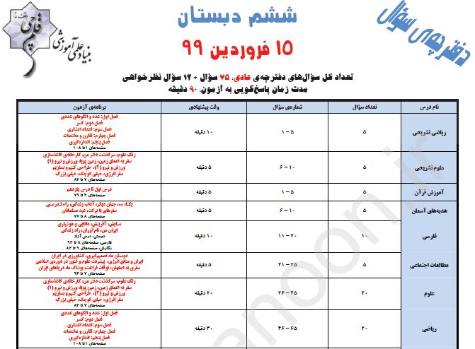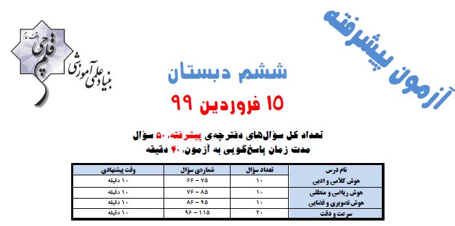 آزمون 15 فروردین مقطع ششم شامل دو دفترچه ی پیشرفت درسی(عادی) و دفترچه ی پیشرفته است.